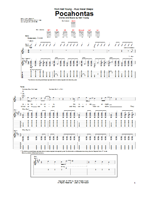 Download or print Neil Young Pocahontas sheet music, chords and digital score arranged for Guitar Tab. This Pop score includes 9 page(s).
