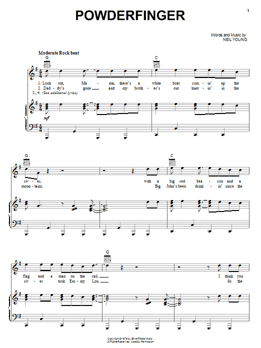 Download or print Neil Young Powderfinger sheet music, chords and digital score arranged for Guitar Tab. This Pop score includes 10 page(s).