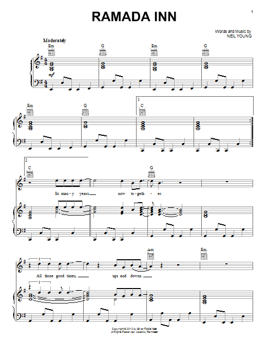 Download or print Neil Young Ramada Inn sheet music, chords and digital score arranged for Piano, Vocal & Guitar Chords (Right-Hand Melody). This Folk score includes 9 page(s).