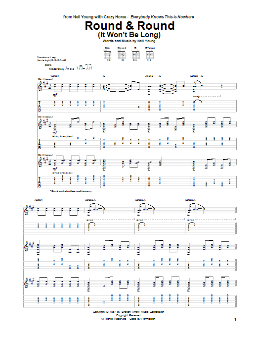 Download or print Neil Young Round & Round (It Won't Be Long) sheet music, chords and digital score arranged for Guitar Tab. This Pop score includes 10 page(s).
