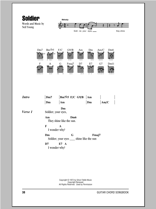 Download or print Neil Young Soldier sheet music, chords and digital score arranged for Guitar Rhythm Tab. This Folk score includes 2 page(s).