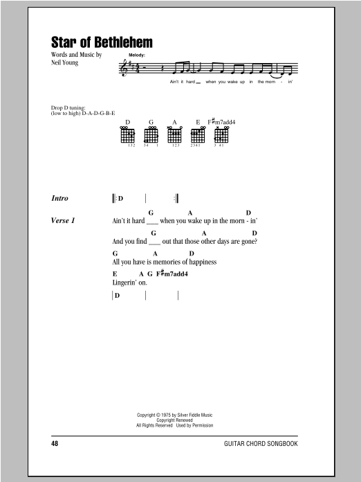 Download or print Neil Young Star Of Bethlehem sheet music, chords and digital score arranged for Guitar Rhythm Tab. This Folk score includes 2 page(s).