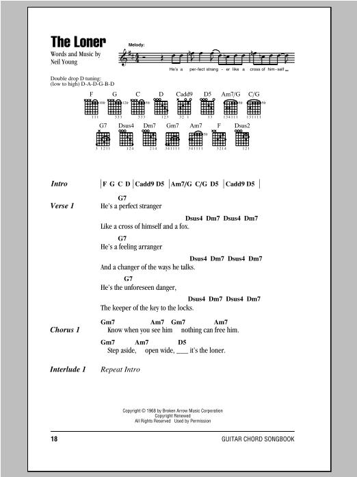 Download or print Neil Young The Loner sheet music, chords and digital score arranged for Guitar Chords/Lyrics. This Folk score includes 2 page(s).