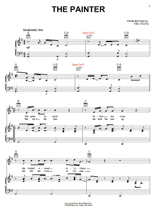 Download or print Neil Young The Painter sheet music, chords and digital score arranged for Piano, Vocal & Guitar Chords (Right-Hand Melody). This Pop score includes 6 page(s).