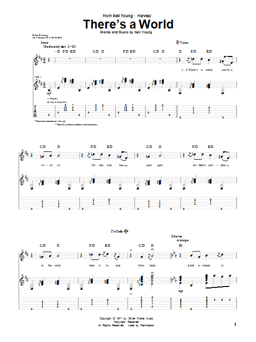 Download or print Neil Young There's A World sheet music, chords and digital score arranged for Guitar Tab. This Pop score includes 3 page(s).