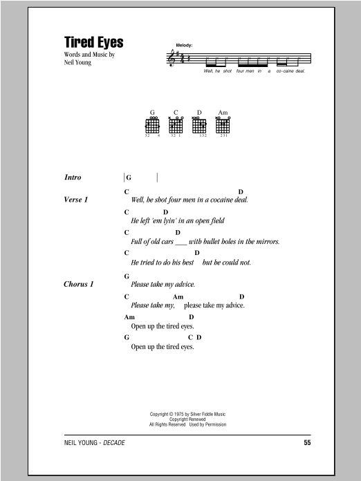 Download or print Neil Young Tired Eyes sheet music, chords and digital score arranged for Guitar Rhythm Tab. This Folk score includes 2 page(s).