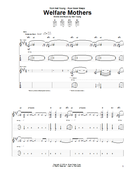 Download or print Neil Young Welfare Mothers sheet music, chords and digital score arranged for Guitar Tab. This Pop score includes 9 page(s).