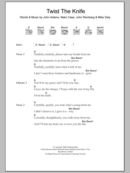 Download or print Neko Case & Her Boyfriends Twist The Knife sheet music, chords and digital score arranged for Guitar Chords/Lyrics. This Country score includes 2 page(s).
