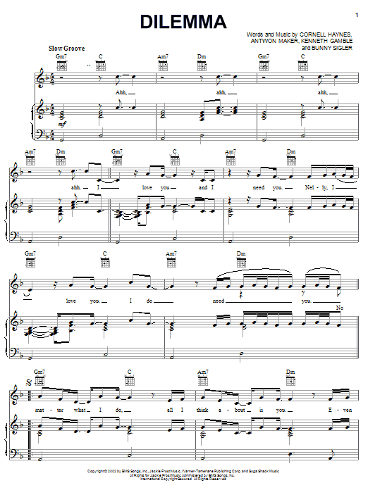 Download or print Nelly featuring Kelly Rowland Dilemma sheet music, chords and digital score arranged for Piano, Vocal & Guitar Chords (Right-Hand Melody). This Hip-Hop score includes 9 page(s).