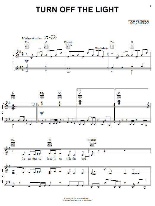 Download or print Nelly Furtado Turn Off The Light sheet music, chords and digital score arranged for Piano, Vocal & Guitar Chords (Right-Hand Melody). This Pop score includes 9 page(s).