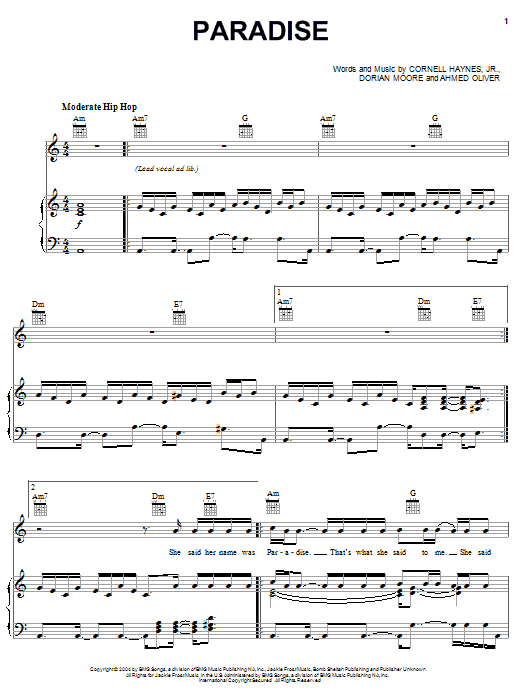 Download or print Nelly Paradise sheet music, chords and digital score arranged for Piano, Vocal & Guitar Chords (Right-Hand Melody). This Hip-Hop score includes 11 page(s).