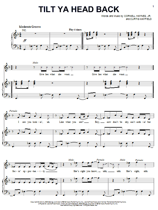 Download or print Nelly featuring Christina Aguilera Tilt Ya Head Back sheet music, chords and digital score arranged for Piano, Vocal & Guitar Chords (Right-Hand Melody). This Hip-Hop score includes 7 page(s).