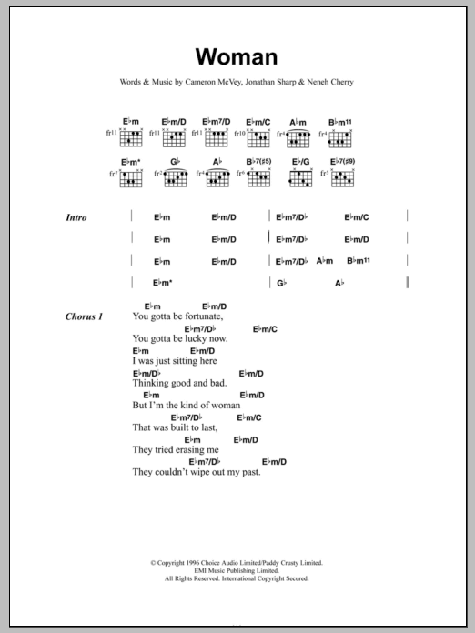 Download or print Neneh Cherry Woman sheet music, chords and digital score arranged for Guitar Chords/Lyrics. This Pop score includes 3 page(s).