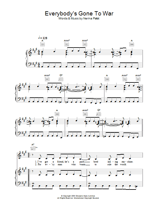 Download or print Nerina Pallot Everybody's Gone To War sheet music, chords and digital score arranged for Piano, Vocal & Guitar Chords. This Pop score includes 5 page(s).