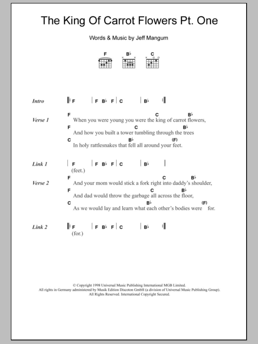 Download or print Neutral Milk Hotel The King Of Carrot Flowers Pt. One sheet music, chords and digital score arranged for Guitar Chords/Lyrics. This Pop score includes 2 page(s).
