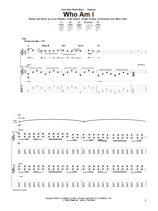 Download or print New Found Glory Who Am I sheet music, chords and digital score arranged for Guitar Tab. This Pop score includes 7 page(s).