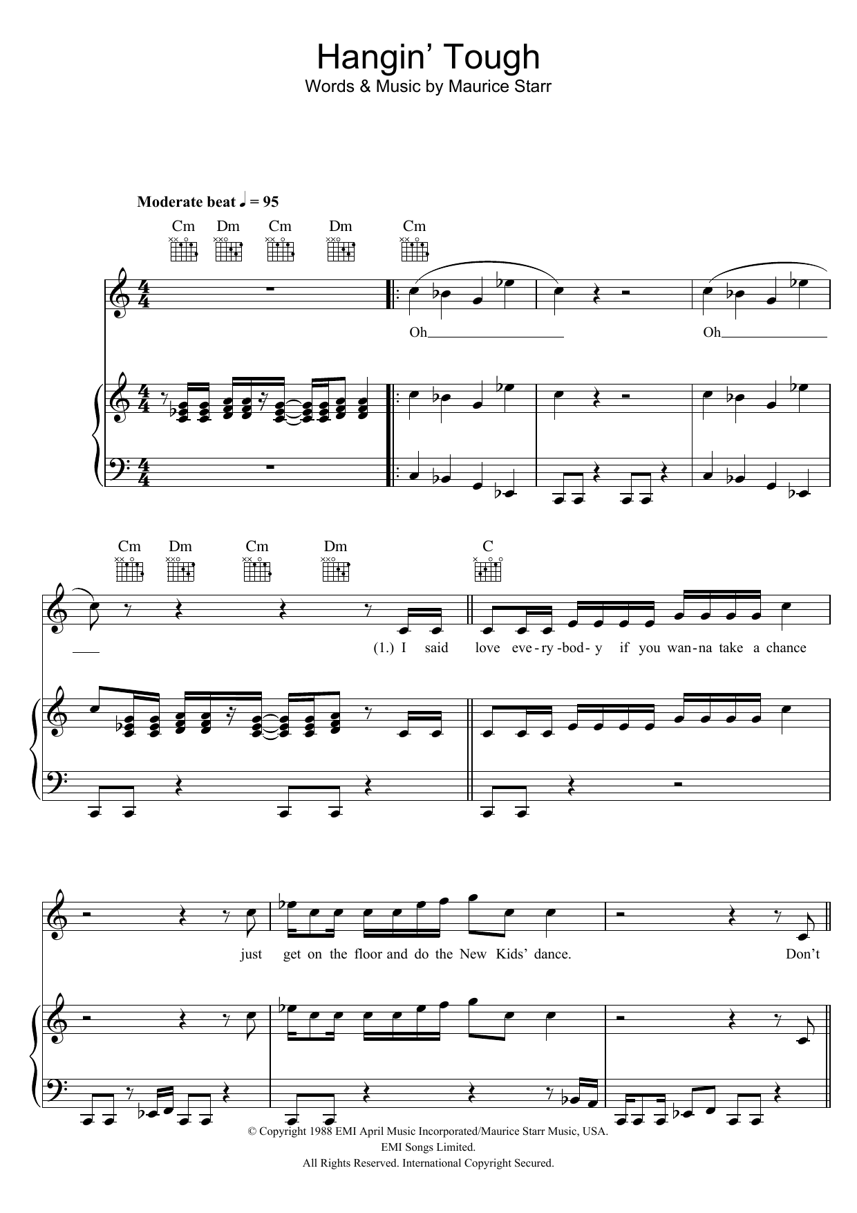 Download or print New Kids On The Block Hangin' Tough sheet music, chords and digital score arranged for Piano, Vocal & Guitar Chords (Right-Hand Melody). This Pop score includes 4 page(s).