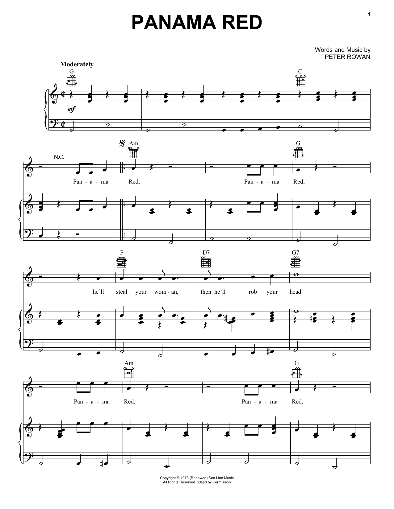 Download or print New Riders of the Purple Sage Panama Red sheet music, chords and digital score arranged for Piano, Vocal & Guitar Chords (Right-Hand Melody). This Jazz score includes 3 page(s).