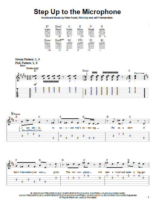 Download or print Newsboys Step Up To The Microphone sheet music, chords and digital score arranged for Easy Guitar Tab. This Christian score includes 4 page(s).