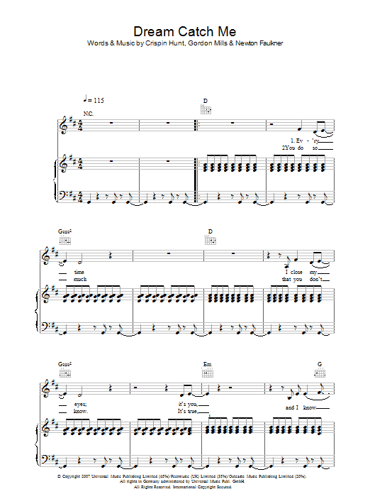 Download or print Newton Faulkner Dream Catch Me sheet music, chords and digital score arranged for Guitar Chords/Lyrics. This Rock score includes 2 page(s).