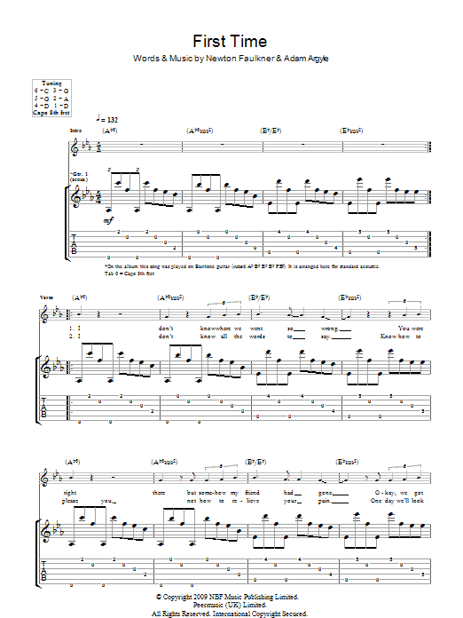 Download or print Newton Faulkner First Time sheet music, chords and digital score arranged for Guitar Tab. This Rock score includes 4 page(s).