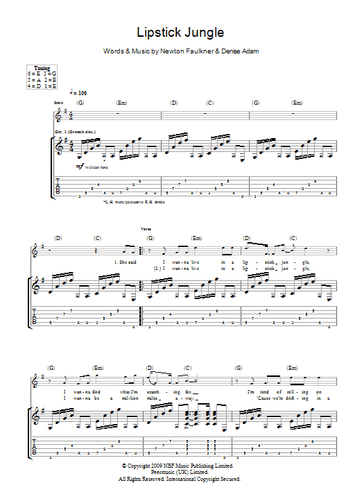 Download or print Newton Faulkner Lipstick Jungle sheet music, chords and digital score arranged for Guitar Tab. This Rock score includes 7 page(s).