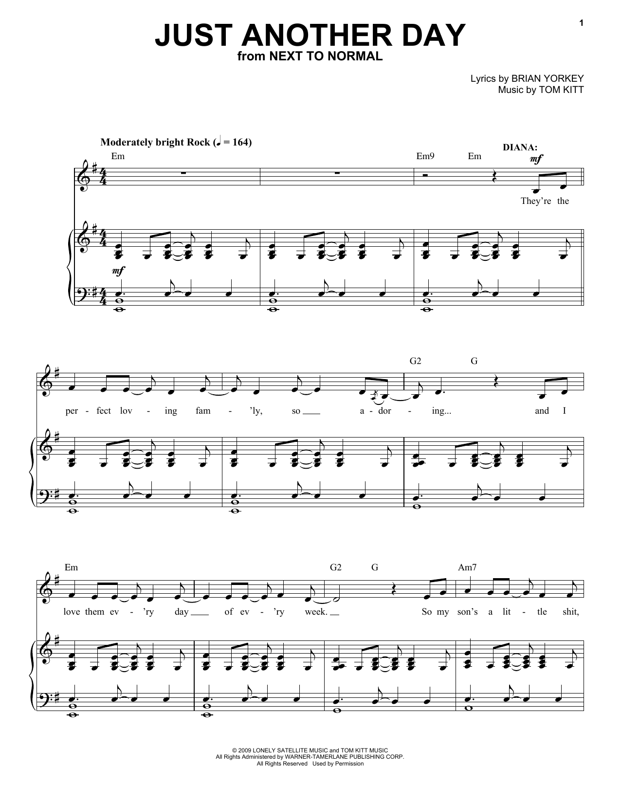 Download or print Next to Normal Cast Just Another Day (from Next to Normal) sheet music, chords and digital score arranged for Piano & Vocal. This Broadway score includes 16 page(s).