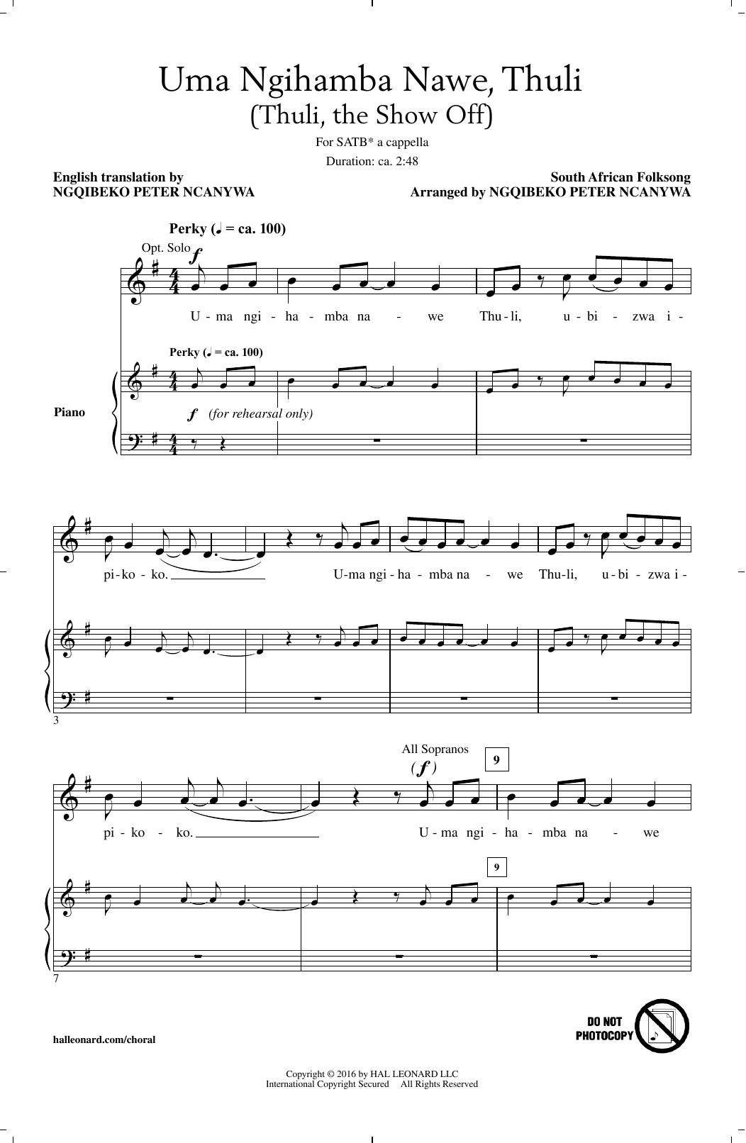 Download or print Ngqibeko Peter Ncanywa Uma Ngihamba Nawe, Thuli (Thuli, The Show Off) sheet music, chords and digital score arranged for SATB Choir. This Concert score includes 9 page(s).