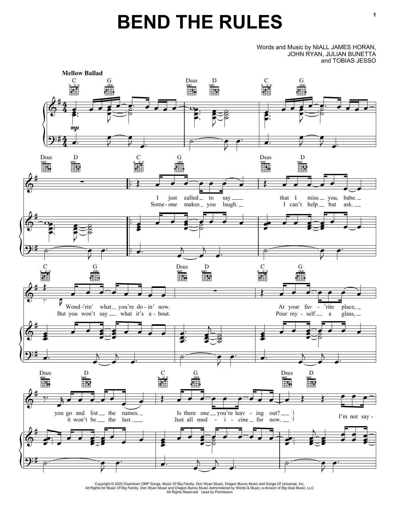 Download or print Niall Horan Bend The Rules sheet music, chords and digital score arranged for Piano, Vocal & Guitar Chords (Right-Hand Melody). This Pop score includes 5 page(s).