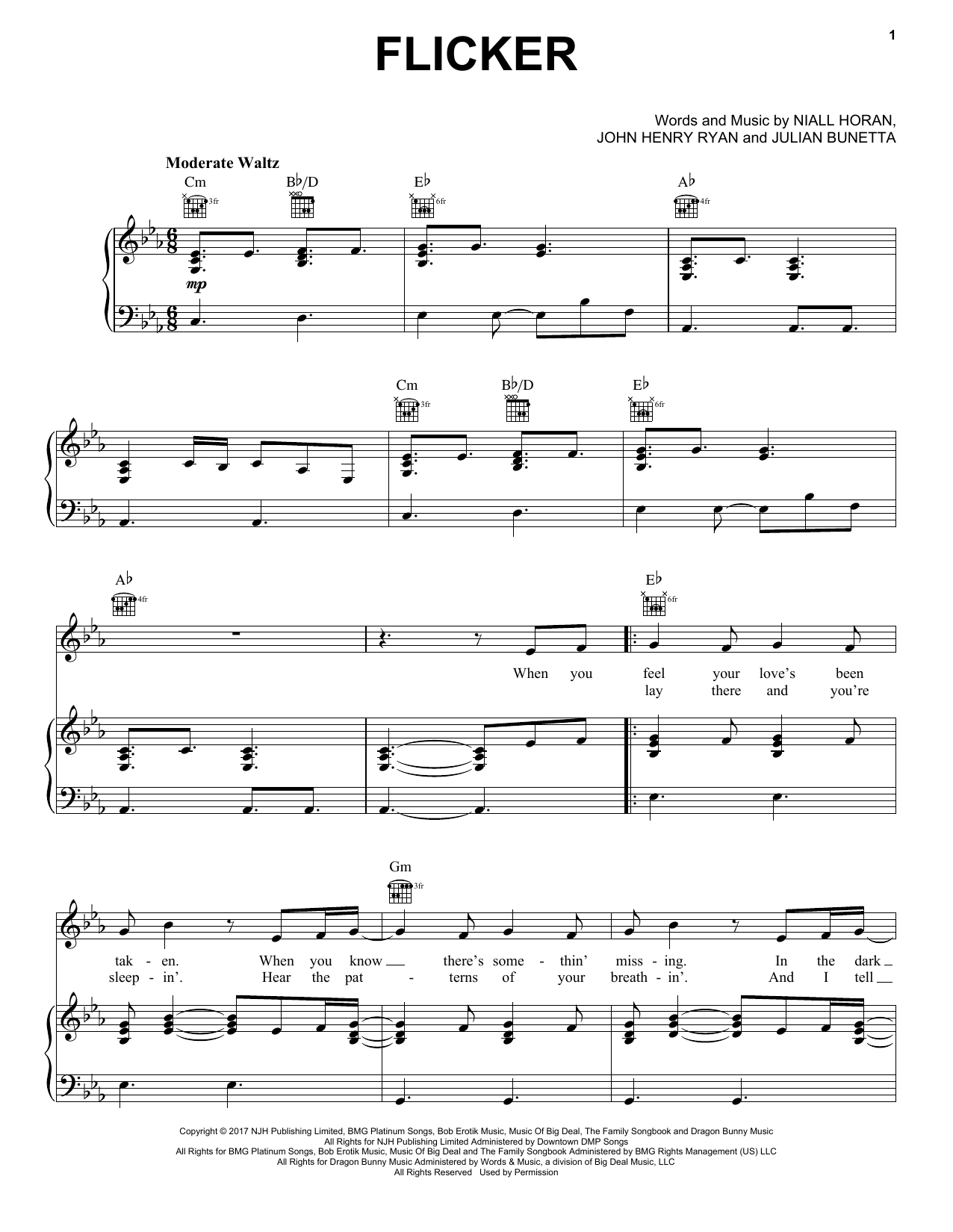 Download or print Niall Horan Flicker sheet music, chords and digital score arranged for Piano, Vocal & Guitar Chords (Right-Hand Melody). This Pop score includes 5 page(s).