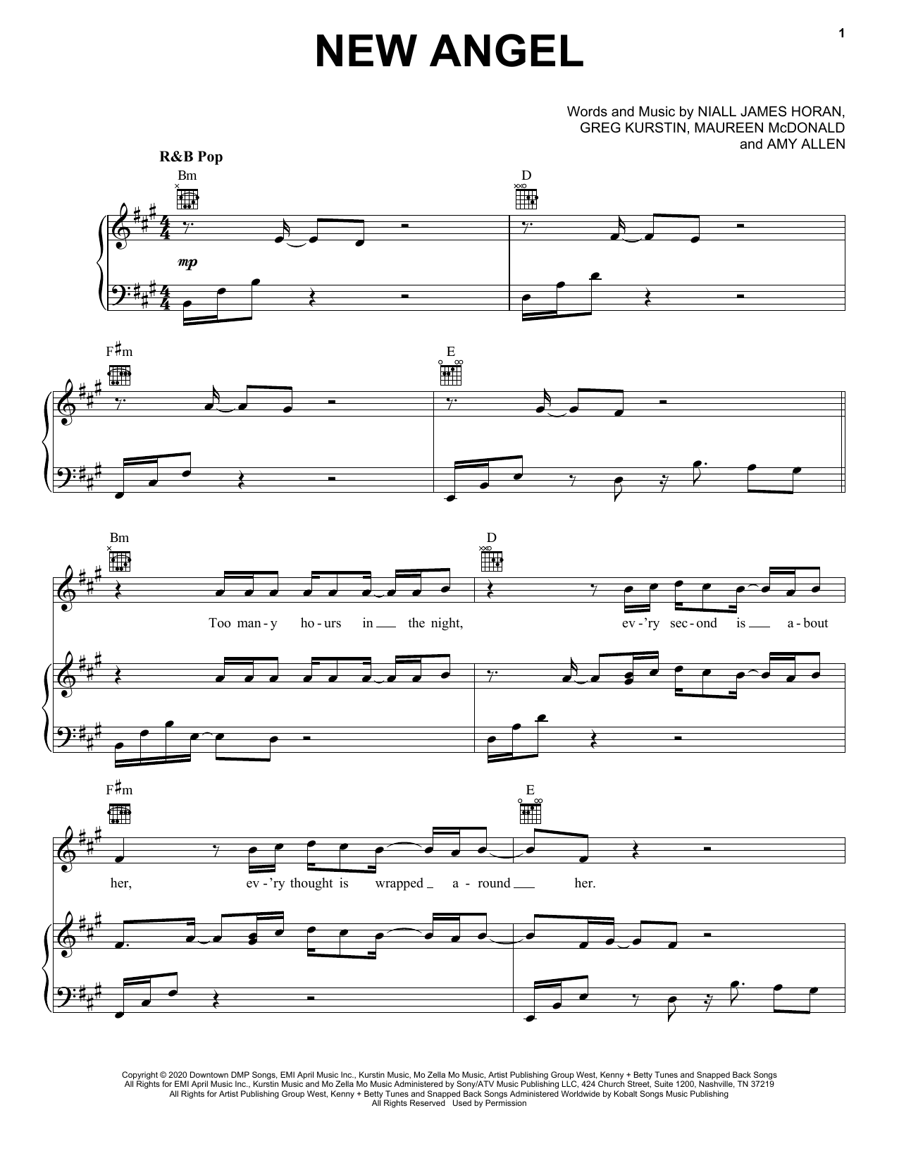 Download or print Niall Horan New Angel sheet music, chords and digital score arranged for Piano, Vocal & Guitar Chords (Right-Hand Melody). This Pop score includes 8 page(s).
