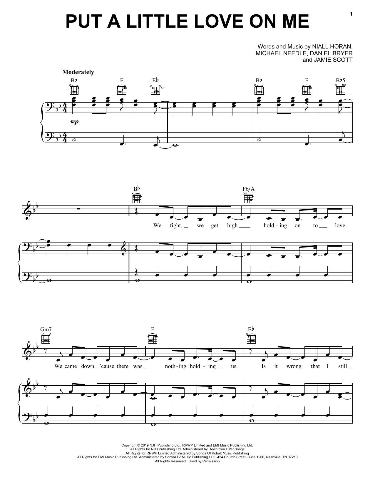 Download or print Niall Horan Put A Little Love On Me sheet music, chords and digital score arranged for Piano, Vocal & Guitar Chords (Right-Hand Melody). This Pop score includes 6 page(s).