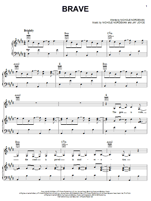 Download or print Nichole Nordeman Brave sheet music, chords and digital score arranged for Piano, Vocal & Guitar Chords (Right-Hand Melody). This Christian score includes 11 page(s).