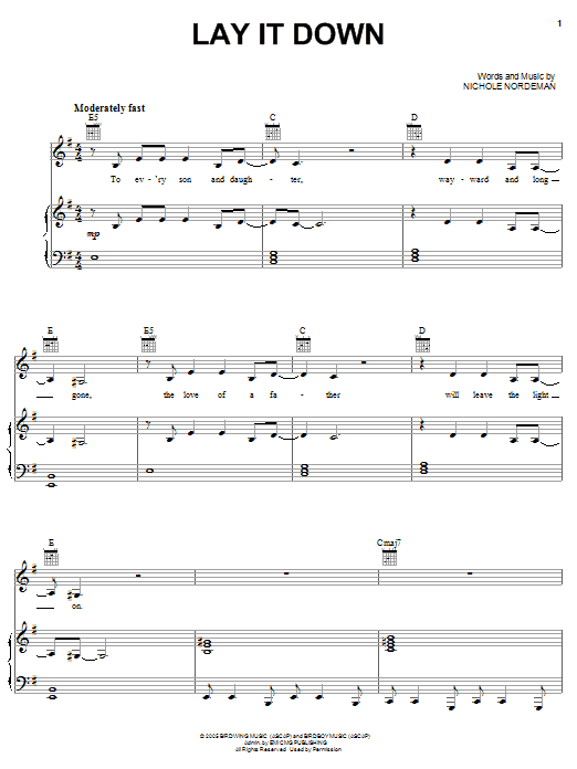 Download or print Nichole Nordeman Lay It Down sheet music, chords and digital score arranged for Piano, Vocal & Guitar Chords (Right-Hand Melody). This Christian score includes 8 page(s).