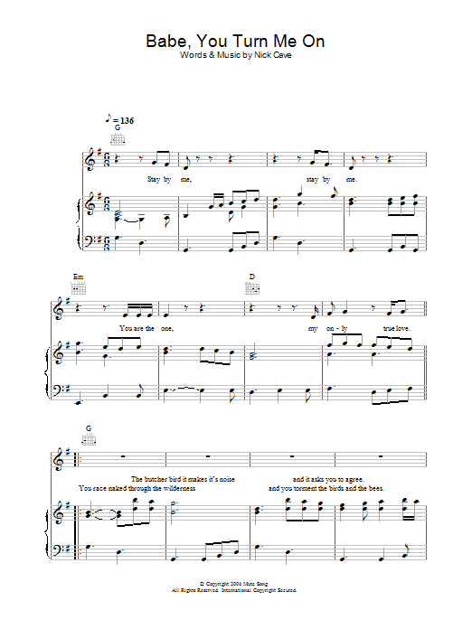 Download or print Nick Cave Babe, You Turn Me On sheet music, chords and digital score arranged for Guitar Chords/Lyrics. This Rock score includes 2 page(s).