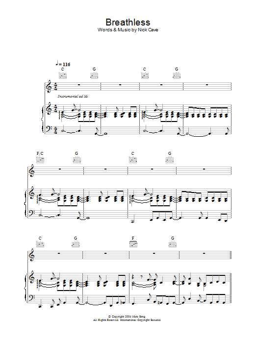 Download or print Nick Cave Breathless sheet music, chords and digital score arranged for Guitar Chords/Lyrics. This Alternative score includes 3 page(s).