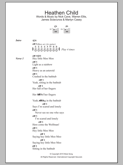 Download or print Grinderman Heathen Child sheet music, chords and digital score arranged for Guitar Chords/Lyrics. This Pop score includes 4 page(s).