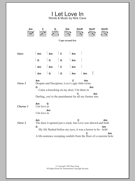 Download or print Nick Cave I Let Love In sheet music, chords and digital score arranged for Guitar Chords/Lyrics. This Pop score includes 3 page(s).