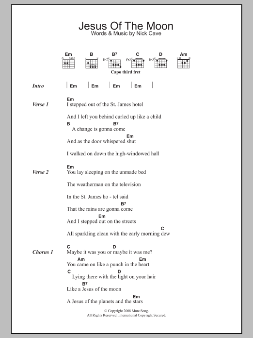 Download or print Nick Cave Jesus Of The Moon sheet music, chords and digital score arranged for Guitar Chords/Lyrics. This Pop score includes 3 page(s).