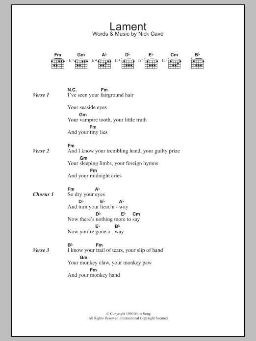 Download or print Nick Cave Lament sheet music, chords and digital score arranged for Guitar Chords/Lyrics. This Pop score includes 3 page(s).