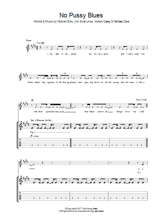 Download or print Grinderman No Pussy Blues sheet music, chords and digital score arranged for Guitar Chords/Lyrics. This Pop score includes 3 page(s).