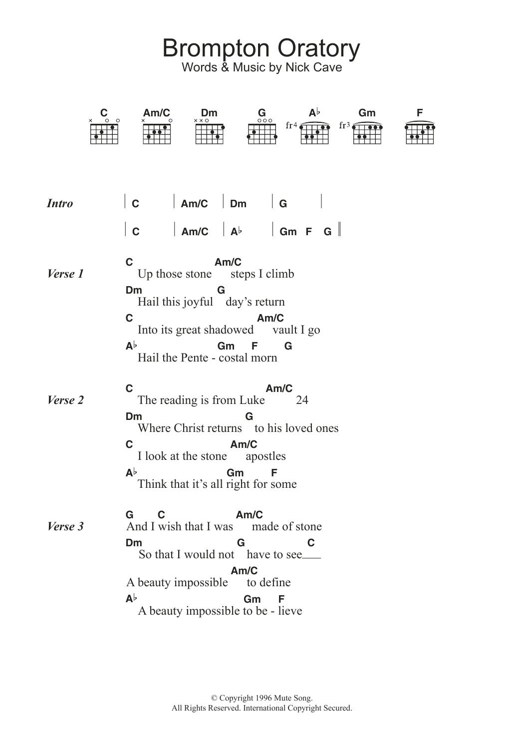 Download or print Nick Cave & The Bad Seeds Brompton Oratory sheet music, chords and digital score arranged for Guitar Chords/Lyrics. This Rock score includes 2 page(s).