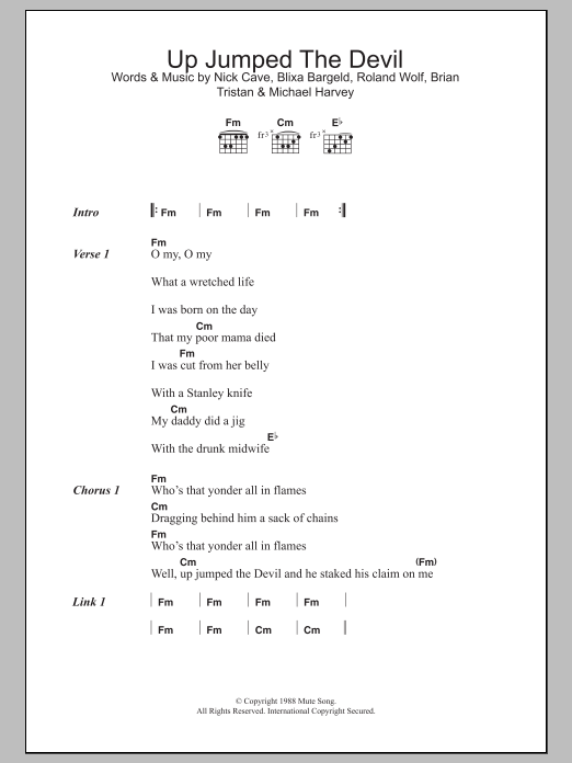 Download or print Nick Cave & The Bad Seeds Up Jumped The Devil sheet music, chords and digital score arranged for Guitar Chords/Lyrics. This Rock score includes 4 page(s).