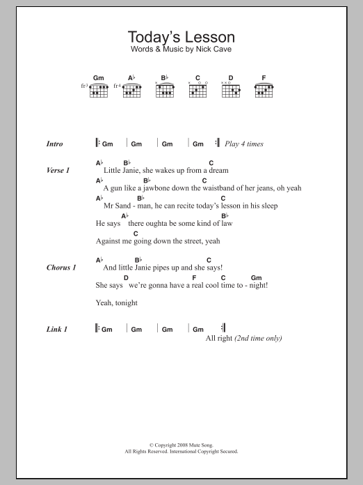 Download or print Nick Cave Today's Lesson sheet music, chords and digital score arranged for Guitar Chords/Lyrics. This Alternative score includes 3 page(s).