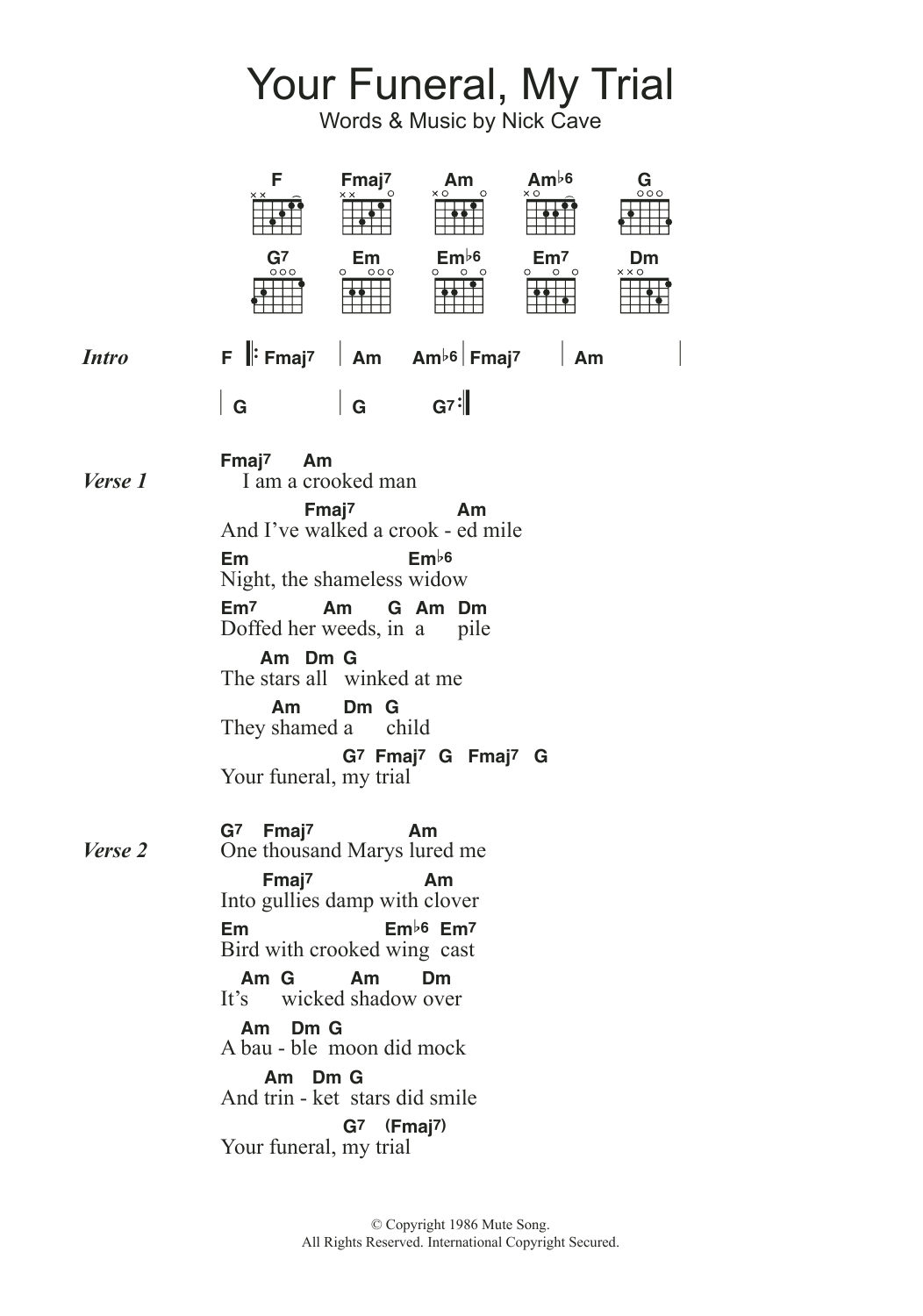 Download or print Nick Cave Your Funeral, My Trial sheet music, chords and digital score arranged for Guitar Chords/Lyrics. This Rock score includes 2 page(s).