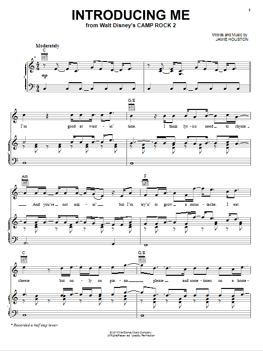 Download or print Nick Jonas Introducing Me (from Camp Rock 2) sheet music, chords and digital score arranged for Piano, Vocal & Guitar Chords (Right-Hand Melody). This Disney score includes 8 page(s).