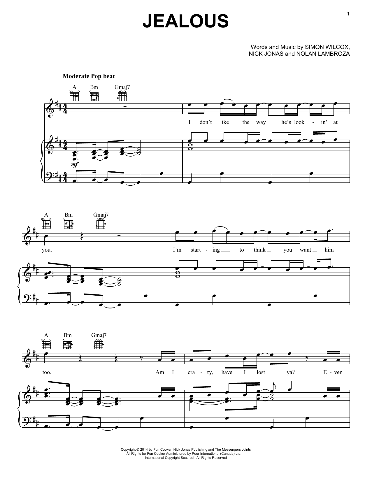 Download or print Nick Jonas Jealous sheet music, chords and digital score arranged for Piano, Vocal & Guitar Chords (Right-Hand Melody). This Pop score includes 6 page(s).