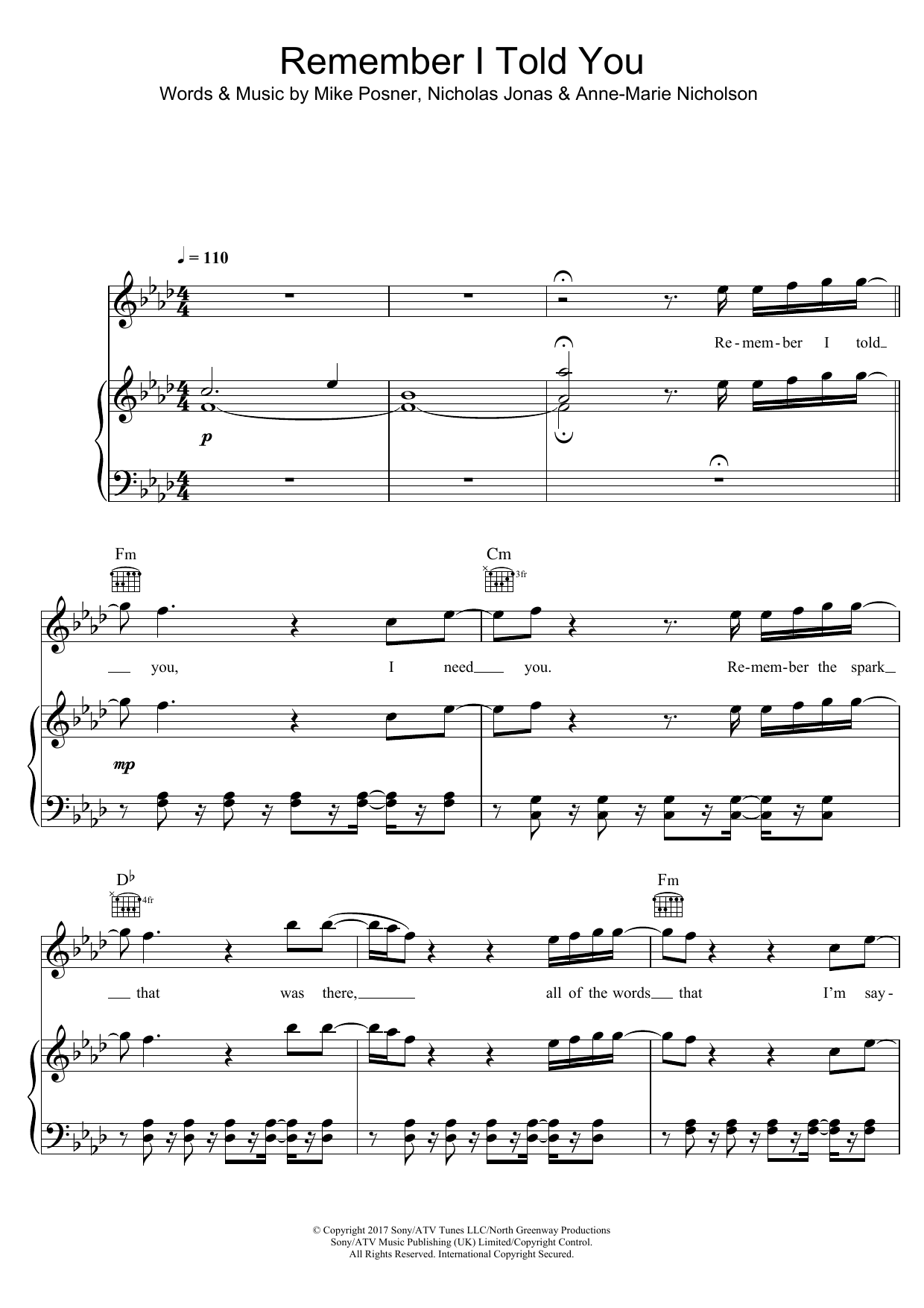 Download or print Nick Jonas Remember I Told You (featuring Anne-Marie) sheet music, chords and digital score arranged for Piano, Vocal & Guitar Chords. This Pop score includes 7 page(s).