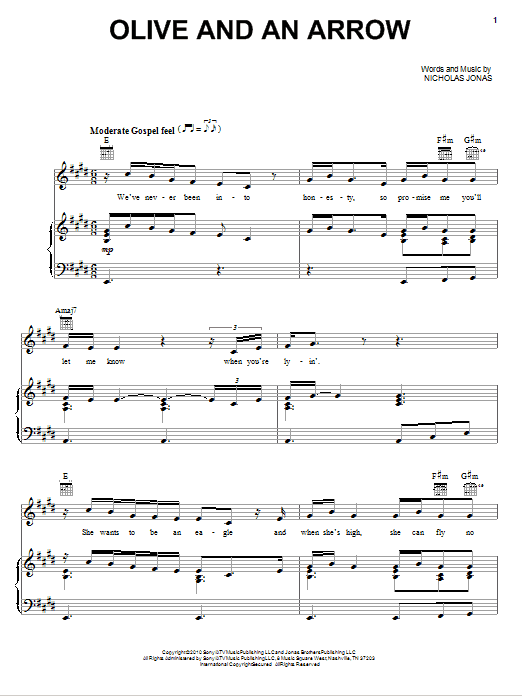 Download or print Nick Jonas & The Administration Olive And An Arrow sheet music, chords and digital score arranged for Piano, Vocal & Guitar Chords (Right-Hand Melody). This Pop score includes 6 page(s).