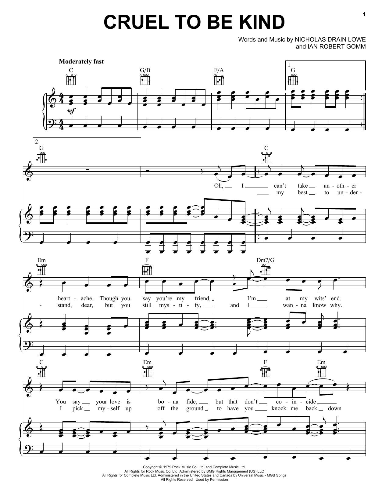 Download or print Nick Lowe Cruel To Be Kind sheet music, chords and digital score arranged for Piano, Vocal & Guitar Chords (Right-Hand Melody). This Pop score includes 5 page(s).